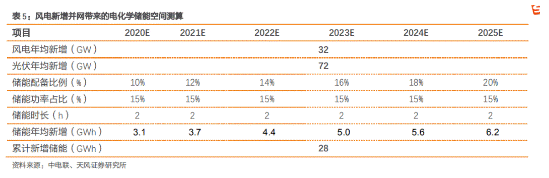 ÔÚÄÜÔ´½á¹¹×ªÐÍ£¬ÐÂÄÜÔ´×°»ú¸ßÔö£¬¸÷µØÕþ¸®ÒªÇóÅäÖô¢ÄܵÄÅä¾°Ï£¬ÎÒÃǶÔÎÒ¹úÐÂÄÜÔ´²¢Íø´øÀ´µÄ´¢ÄÜ¿Õ¼ä½øÐвâËã¡£Ô¤¼Æ 2020-2025 Äê¼ä£¬·çµç¡¢¹â·ü²¢Íø´øÀ´µÄÐÂÔö´¢ÄÜÐèÇóºÏ¼ÆÎª 28GWh£¬Äê¾ùÐÂÔö´¢ÄÜÐèÇóΪ 4.7GWh¡£²âËã¼ÙÉ裺¢ÙÐÂÔö×°»ú£ºÆ¾¾Ý±í 3 µÄ²âËã½á¹û£¬¼Ù¶¨ 2020-2025 Ä꣬·çµç¹â·üÐÂÔö×°»ú³ÊÏßÐÔÔö³¤£¬Ã¿ÄêºÏ¼ÆÐÂÔö×°»ú¹æÄ£ 104GW£»¢Ú´¢ÄÜÅä±ÈÂÊ£º´Ó 2020 Äê¸÷µØÒªÇóµÄ´¢ÄÜÅä±ÈÂÊÀ´¿´£¬×îµÍÅä±ÈÒªÇó 5%£¬×î¸ßÅä±ÈÒªÇó 20%¡£ÎÒÃǼٶ¨ 2020 ÄêʵÏÖÅä±ÈÂÊ 10%£¬ÒÔºóÿÄêÅä±ÈÂÊÖð½¥ÉÏÉý 2pct£¬ÖÁ 2025 ÄêʵÏÖÅä±ÈÂÊ 20%£»¢Û´¢Äܹ¦ÂÊÕ¼±È£ºÆ¾¾ÝÏÖÓд¢ÄÜÏîÄ¿¹¦ÂÊÅä±ÈÇé¿ö£¬¼ÙÉèΪ 15%£»¢Ü´¢ÄÜʱ³¤£º°´ 2h µÄƽ¾ù±¸µçʱ³¤×÷Ϊ¹ÀËãÖµ¡£??
